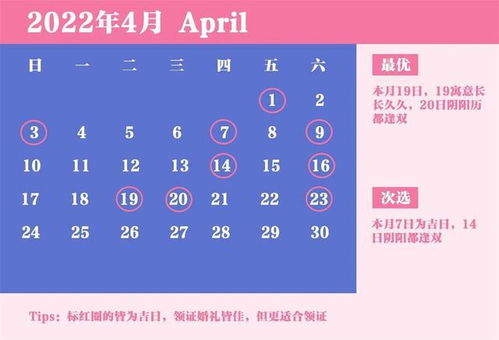 - 四月份:除常规宜嫁娶表外 还包括4 月7 日(庚寅日属猪、马、狗者适宜;属猴、蛇、虎者不宜),4 月9 日(壬辰日属鸡、猴、鼠者适宜;属狗、龙者不宜),以及4 月14 日(丁酉日属龙、蛇者适宜)。还有啊,还需关注4 月22 日作为另一重要领证吉日在当年的记录。